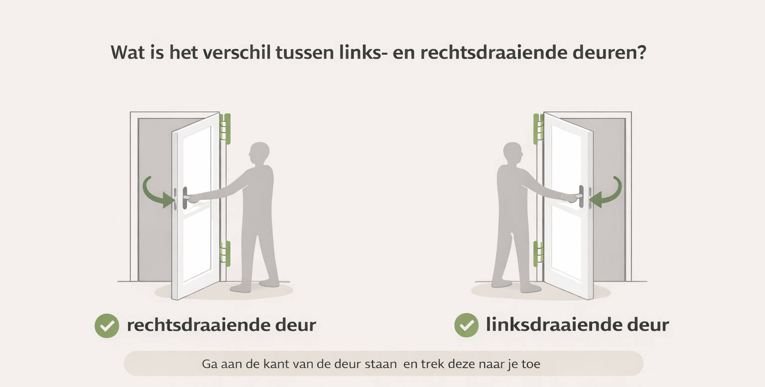 Bij het bestellen van een binnendeur moet je altijd aangeven of de deur links- of rechtsdraaiend is. Het lijkt een eenvoudige keuze, maar in de praktijk wordt de draairichting regelmatig verkeerd bepaald. Dat kan leiden tot fouten bij levering en montage. In dit kennisartikel leggen we duidelijk uit wat het verschil is tussen een links- en rechtsdraaiende deur en hoe je de draairichting eenvoudig zelf bepaalt.